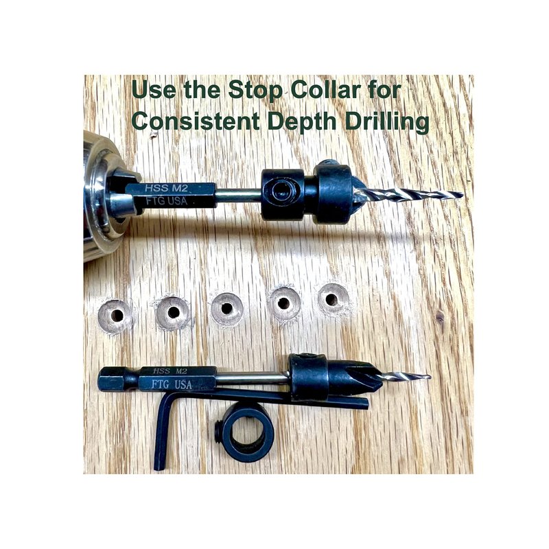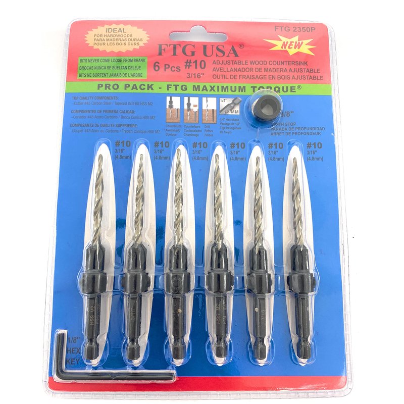 FTG USA 6 Piece same size Pro Pack - Maximum Torque - Bits secured with pin Never come loose from shank. Adjustable Wood Countersink (#10) 3/16" feature the best tapered drill bits 3rd Party Tested HSS M2, by far the most popular High-Speed Steel, M2 has superior properties, including high toughness, wear resistance, and good cutting retention. Logo brand is laser printed on each countersink shank making it easier to differentiate this quality brand from others. Counterbore size 3/8", Plug size 3/8". Super sharp, exceptionally durable, easy to use, and built to perform well in both hard and soft woods. Drill, countersink and counterbore in 1 step. Top quality material #45 Carbon Steel adjustable four-cutter counter bore chamfer angle 82 degree, attachment that cuts fast and clears chips quickly for fast, smooth countersinking applications. The counter bore feature attaches flats on shank with 2 hex screws for a secure fit and can be adjusted for controlled pilot hole depth providing a clean finish for more polished final products. 1 Hex Key (Allen Wrench) and 1 Depth Stop Collar included. This product is Professionally manufactured in China at FTG USA specifications. Packaging set combination/design protected by US Copyright Office