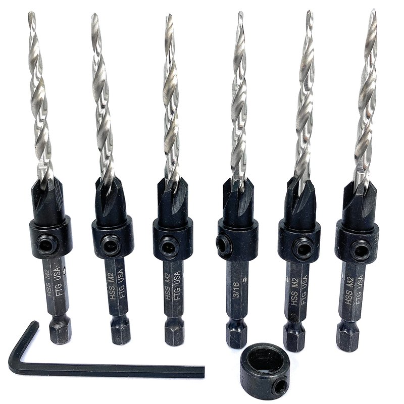 - Countersink drill bit set for wood with tapered drill bit , 4 Flute countersink cutter #45 Carbon Steel, tapered countersink set features 6 Piece Pro drill set Same Size drill bits with countersink #10 (3/16") Adjustable wood countersink, 1 Depth Stop Collar 3/8", 1 Hex Wrench (1/8" Allen Key). Counter-bore, and wood plugs size 3/8 inch. Hex shank compatible with 1/4" standard Quick Change chuck including impact drills. FTG 2350P counter sinker drill bit for wood