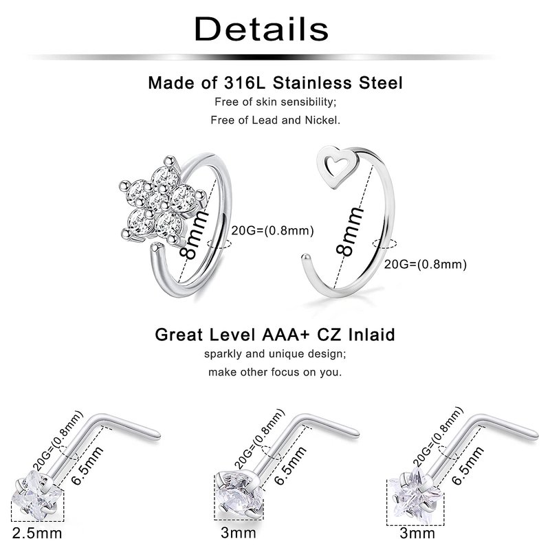 - THICKNESS: Gauge Size: 20G (0.8mm); CZ Top Diameter: 3mm; Wearable Bar Length of Nose Studs: 6.5mm; Inner Diameter of Nose Hoop: 8mm (5/16"); Color: Silver-tone.