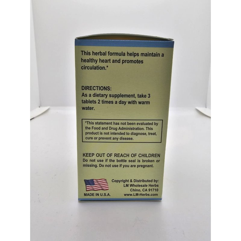 An herbal supplement to help maintain cardiovascular functions and a healthy circulatory system. Also helps promote blood circulation to remove blood stasis, and regulate qi flow to relieve pain. It is applicable for chest distress and angina. Directions: As a dietary supplement, take 3 tablets 2 times a day with warm water. Ingredients: Salvia, Tienchi, Ligusticum Wallichii Packing: 50 Tablets / 500mg each KEEP OUT OF REACH OF CHILDREN Do Not use if the bottle seal is broken or missing. Do not use if you are pregnant. Made in USA
