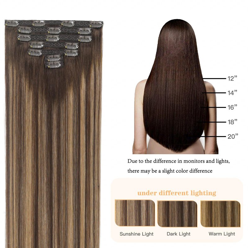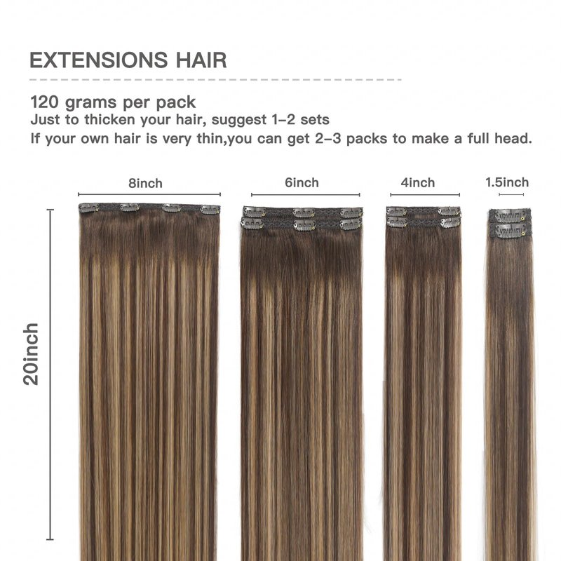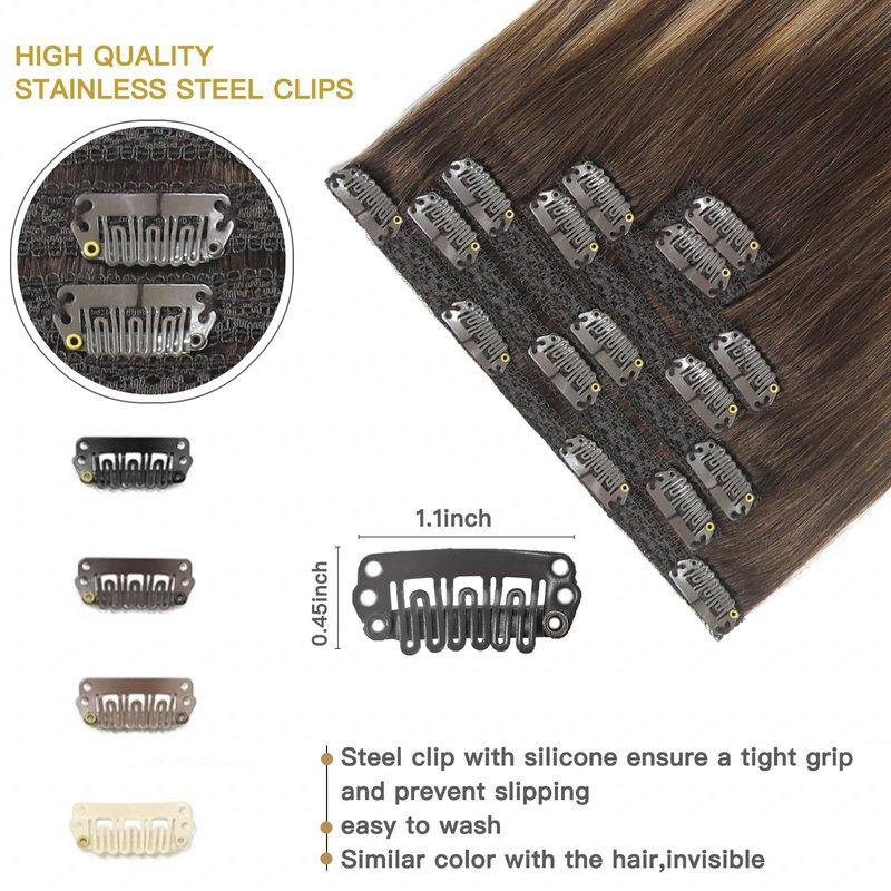 - 【Specifications of Human Hair Extensions】clip in human hair extensions, 7 pieces 120g with 16 clips per set. 105g net weight without clips, 120g with clips. If you want to add length and volume, we recommend 1-2 sets, for a full head, suggest 2-3 sets. If you want to add Highlights Color Effect, we recommend purchasing with our 30G clip-in hair extensions together. When the weight is the same , the longer size will be thinner than the shorter size.
