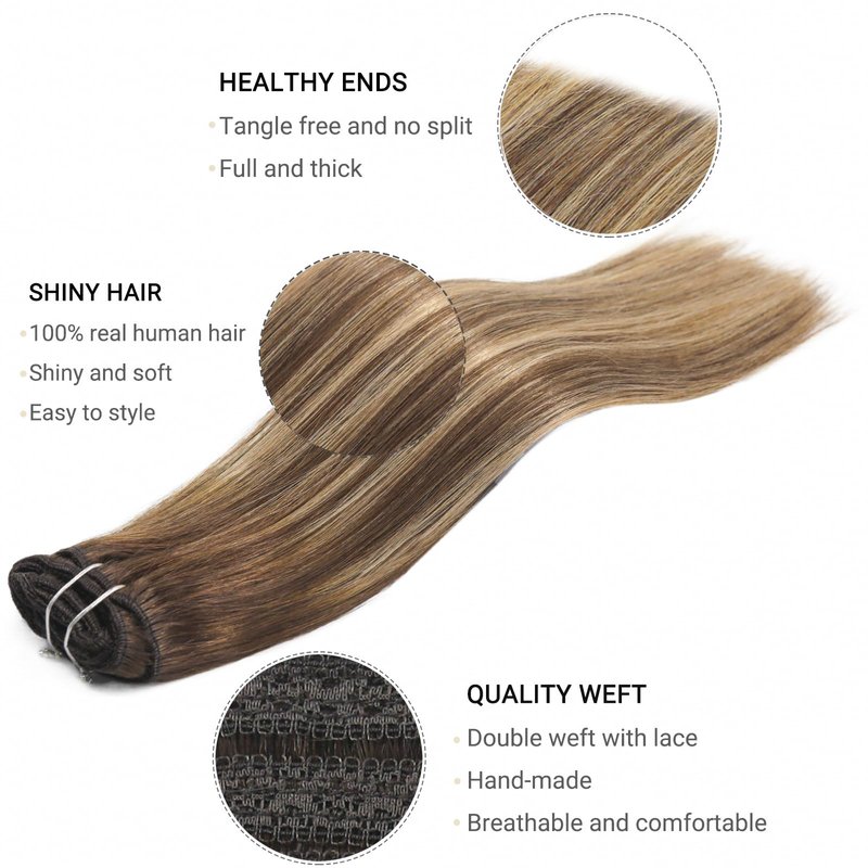 - 【High Quality Real Human Hair Clip in】Our clip in hair extensions are made from 100% Remy Human Hair. As smooth and soft as your own hair, tangle-free and non-shedding, double weft covered by lace, more breathable and comfortable. Cut, washed, dyed, straightened and curled to your liking and it can combs and styles easily. You can use our hair extensions in any scene, you will be more charming and shining.