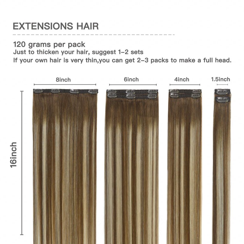 - 【Specifications of Human Hair Extensions】clip in human hair extensions, 7 pieces 120g with 16 clips per set. 105g net weight without clips, 120g with clips. If you want to add length and volume, we recommend 1-2 sets, for a full head, suggest 2-3 sets. If you want to add Highlights Color Effect, we recommend purchasing with our 30G clip-in hair extensions together. When the weight is the same , the longer size will be thinner than the shorter size.