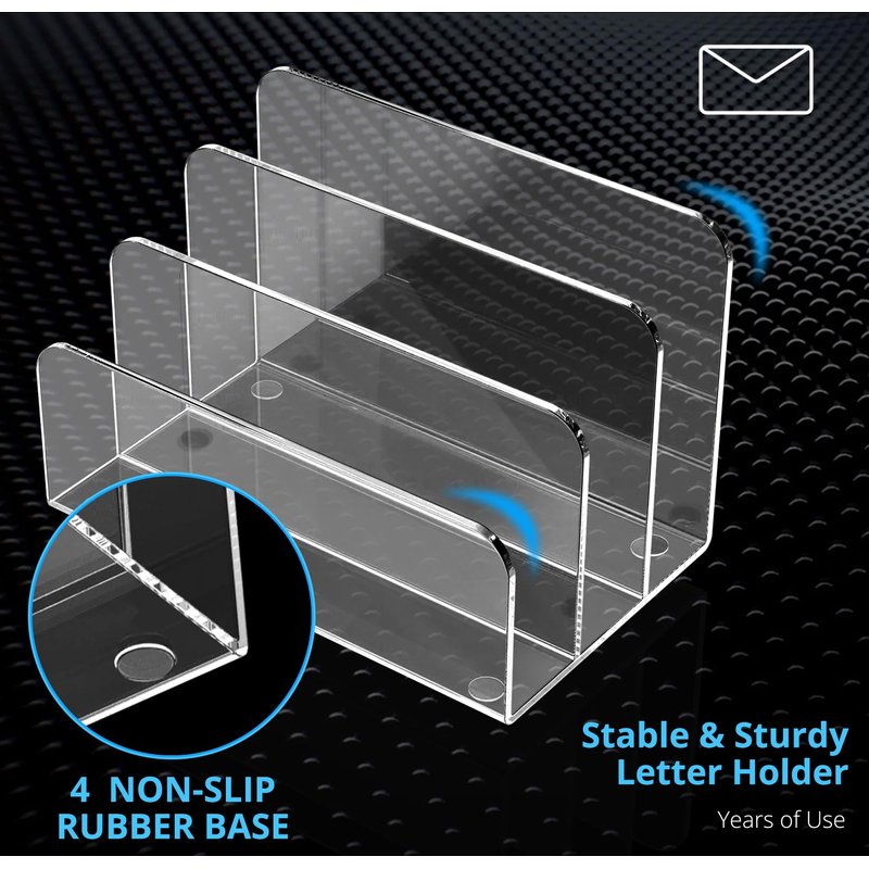 Acrylic File Organizer, Clear 3 Sections File Sorter for Desk Looks nice and classy to organize daily stuff. Progressive height design more suitable for actual use requirements. 4 rubber feet at the bottom to prevent surface wear and scratching. Part of the acrylic desk countertop accessory collection to enhance your desk and compliment any decor Vertical opening design - using the acrylic file holder, you can clearly see what's in place and easy to pick up Save space and eliminate clutter - each compartment is 2 inches, 3 section helps organize office documents orderly, saving lots of desk space. Multi-purpose - acrylic desk organizer sorts files, mails, letters, documents, and envelopes in office or school; holds magazines, books, recipe at home; organizes eyeshadow, make palette in bedroom or bathroom.