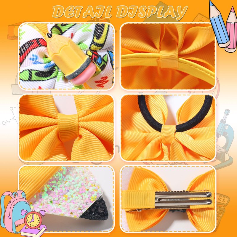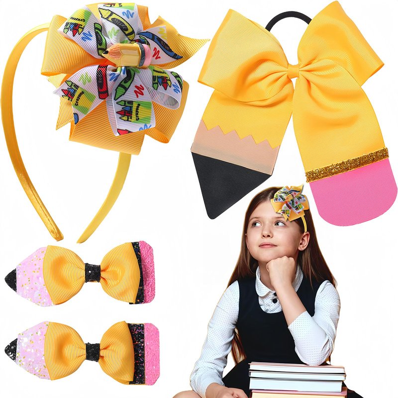 - 【Set includes】: You will receive 4 yellow pencil bow hair accessories, including 1 large bow pencil headband, 2 pencil bow Hair clips, 1 large bow Hair Scrunchies, a total of 4 hair accessories. Colorful, exquisite shape, diverse styles, sufficient quantity to meet your hair accessories and clothing needs.
