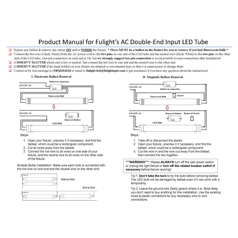 - ***This Is Not a Plug-and-Play Type***: Disconnect the ballast and rewire the hot wire to one end of your fixture, and the neutral wire to the other end. If your fixture has been previously rewired for LED, please verify whether it's been set up for single-ended input LED tubes. If this is the case, you'll need to modify it to a double-ended wire setting, as plugging a double-ended input LED tube into a single-ended powered fixture will result in an electric shock. You can find the installation manual attached as the 2nd photo in the top left corner of this product page. We strongly recommend reviewing it before making a purchase.