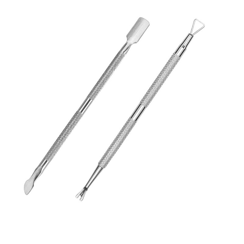 - 【Two in One Cuticle Pusher】 Dual-end pusher with 2 different tools. Use to push and design easily the cuticles on one side, and remove leftover skin or glue on the other side.