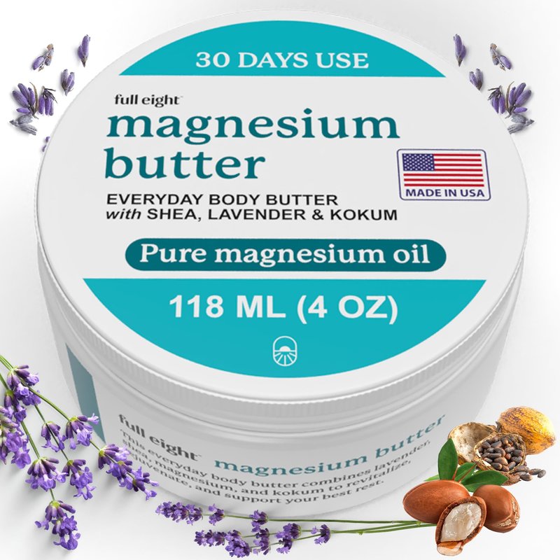 - SLUMBER SOUNDLY: Enhance your nighttime routine with Full Eight’s magnesium butter. This gentle topical cream offers care to your body, eases muscle tightness, and encourages a peaceful transition into a peaceful night.