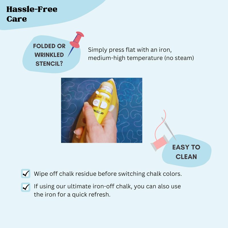 - EASY MAINTENANCE - Easy to clean using a damp cloth or dry microfiber towel for virtually unlimited uses! You can also iron the stencil with a warm iron to clean the chalk dust off if using the Ultimate Quilt Pounce Pad