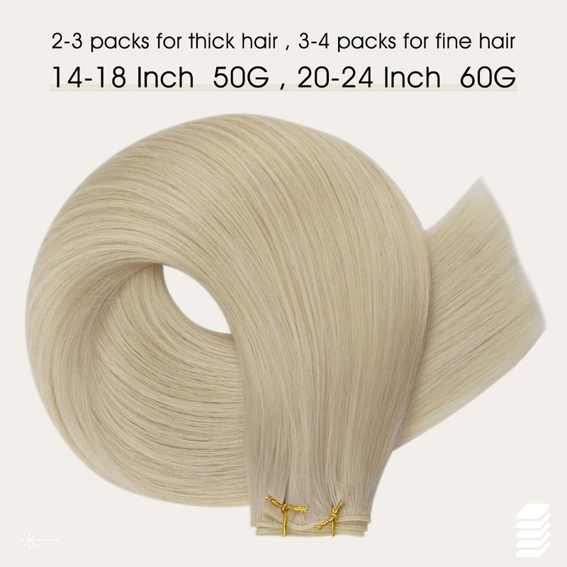 - 【Specifications 】Full Shine genius weft hair extensions human hair specifications :14-18 inch,50 grams one pack; 20-24 inch,60 grams one pack .Usually,2-3 packs for full head attachment.You can attach to the natural hair using various methods such as sewing, clips, or glue.