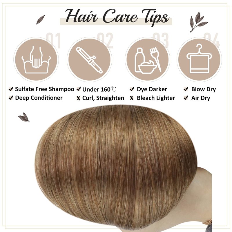 - 【Don't Bleach&Dye】Please do not try to dye or bleach your FullShine human hair extensions,unless you are a very professional hairdresser.Because our hair extensions has undergone dyeing and other treatments,further bleaching or dyeing can damage the hair quality and shorten its lifespan.