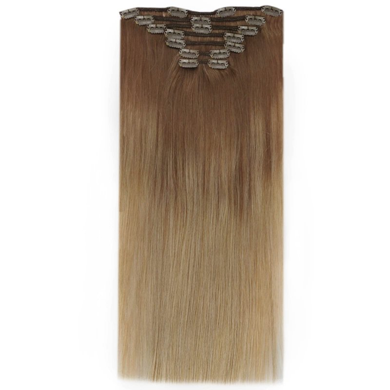 Full Shine Balayage Clip in Hair Extension Human Hair Color 10 Golden Brown Fading to 14 Brown And Blonde Remy Clip in Extensions Silky Straight Natural Extensions for Women 120 Gram 7 Pcs 18 Inch