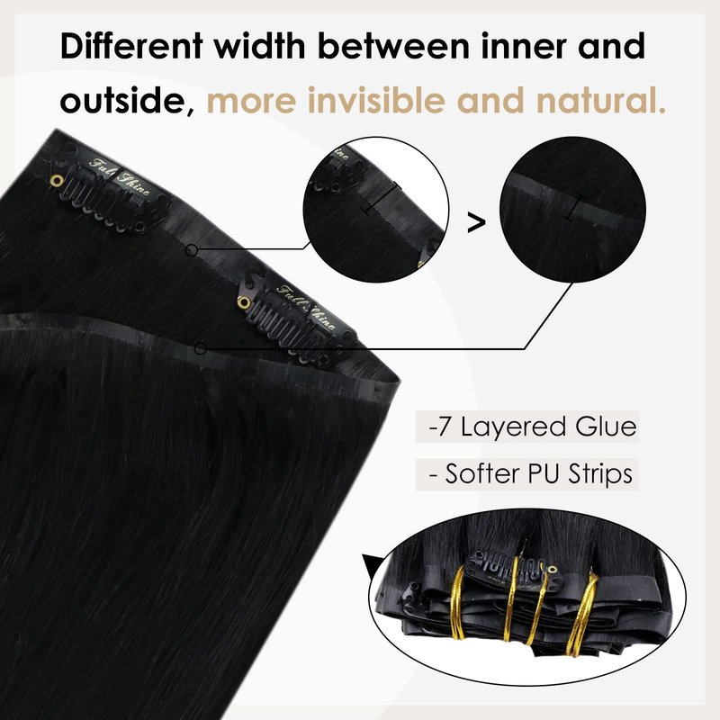 - 【Skin Weft--Invisible & Comfortable & Lighter】Our PU clip hair extensions use latest skin-weft technology to evenly distribute more hair on the PU strip compared to traditional clip-ins.Our new PU clip hair extensions secure the hair on the PU strip, making them more discreet, comfortable, natural, and lightweight. The PU design is seamlessly blended with your scalp and closely matches your skin tone. The outer PU part on each piece is shorter than the inner PU part, so it can be more invisible.