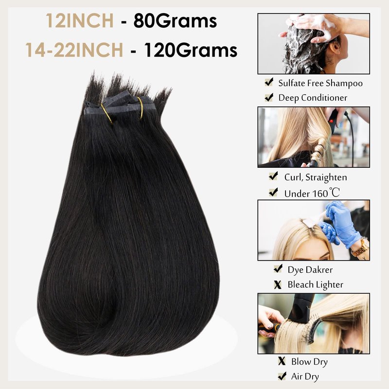 - 【Full Shine Seamless Clip Ins Specification】Full shine invisible human hair clip in extensions 12inch-80g,14-22inch 120g with clips, they are all 8pcs,If you have thick hair, we recommend 1-2 packs to add weight, 2-3 packs to add length. If you have thin hair, we recommend 1-2 packs to add length, 2-3 packs to add weight.