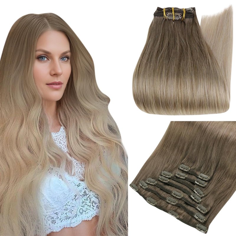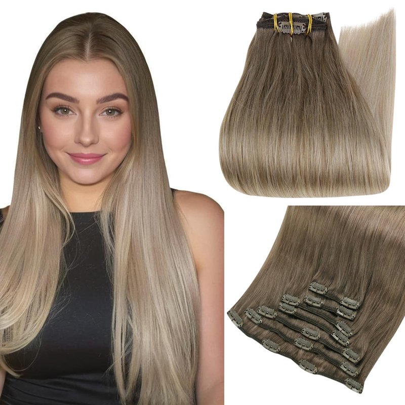 Full Shine Clip in Blonde Human Hair Extensions 14 Inch Ash Brown Ombre Ash Blonde Balayage Clip in Extensions Invisible Remy Hair Extensions Clip in Human Hair Natural Looking Hair Extensions