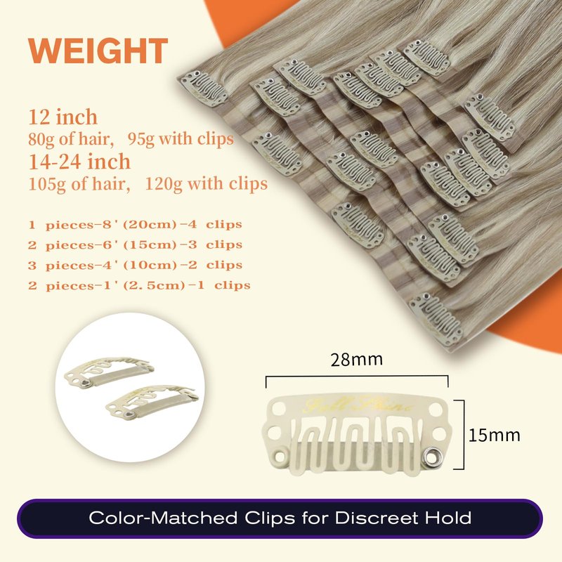 - 【Full Shine Seamless Clip Ins Specification】Full shine invisible human hair clip in extensions 12inch-80g,14-22inch 120g with clips, they are all 8pcs,If you have thick hair, we recommend 1-2 packs to add weight, 2-3 packs to add length. If you have thin hair, we recommend 1-2 packs to add length, 2-3 packs to add weight.