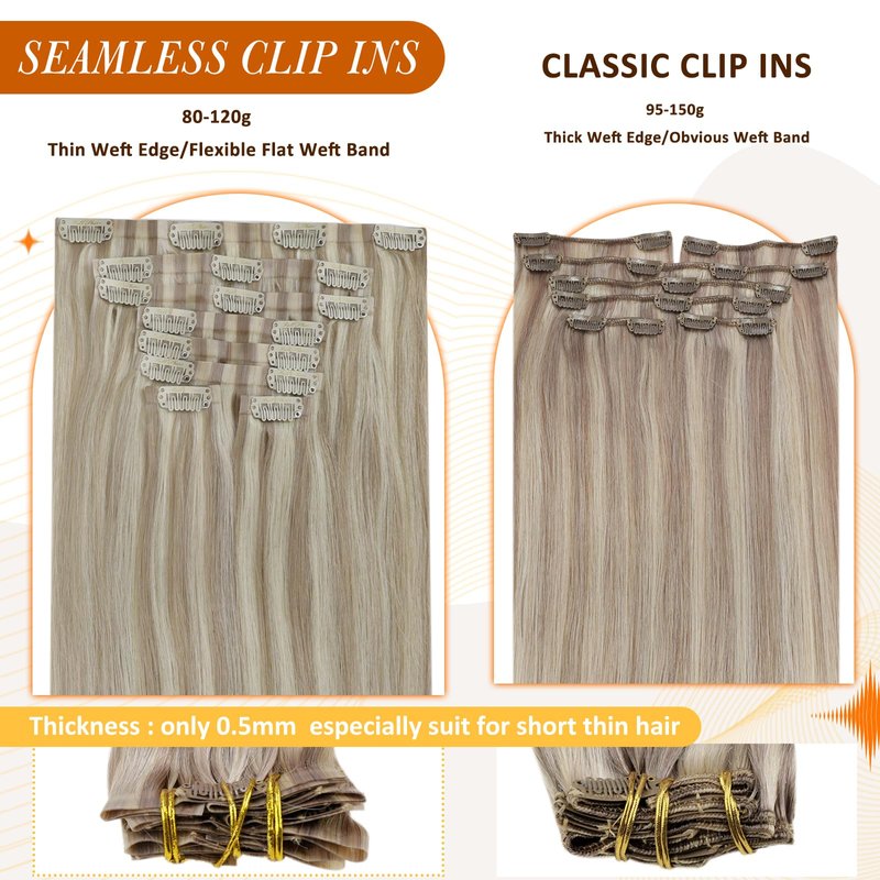 - 【Skin Weft--Invisible & Comfortable & Lighter】Our PU clip hair extensions use latest skin-weft technology to evenly distribute more hair on the PU strip compared to traditional clip-ins.Our new PU clip hair extensions secure the hair on the PU strip, making them more discreet, comfortable, natural, and lightweight. The PU design is seamlessly blended with your scalp and closely matches your skin tone. The outer PU part on each piece is shorter than the inner PU part, so it can be more invisible.