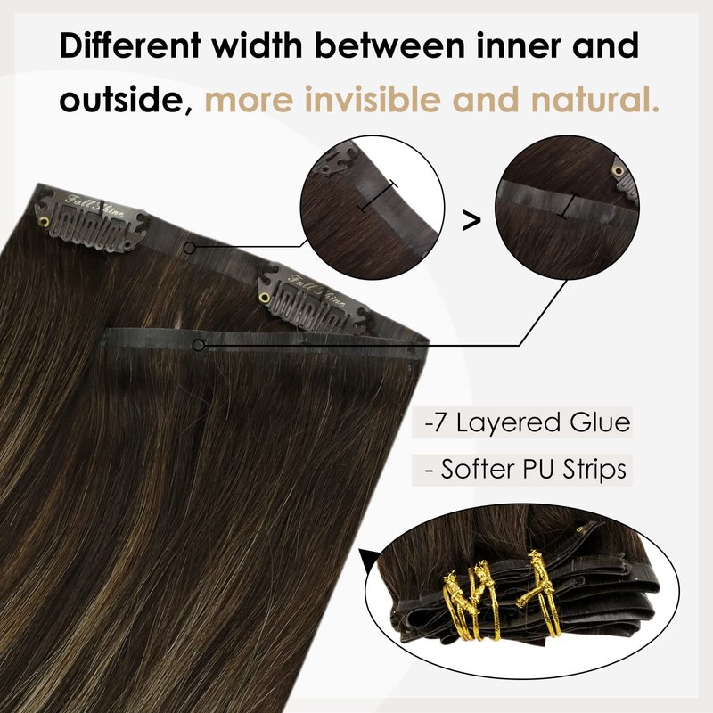 - 【Skin Weft--Invisible & Comfortable & Lighter】Our PU clip hair extensions use latest skin-weft technology to evenly distribute more hair on the PU strip compared to traditional clip-ins.Our new PU clip hair extensions secure the hair on the PU strip, making them more discreet, comfortable, natural, and lightweight. The PU design is seamlessly blended with your scalp and closely matches your skin tone. The outer PU part on each piece is shorter than the inner PU part, so it can be more invisible.