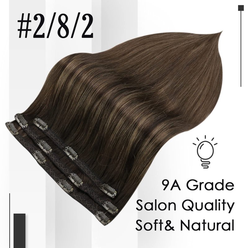 Full Shine Ombre Clip in Hair Extensions Dark Brown Fading to Brown And Ash Brown 2/8/2 Brazilian Human Hair Extensions Lace Double Weft Balayage Brown Remy Hair 3Pcs 50Grams 18 Inch