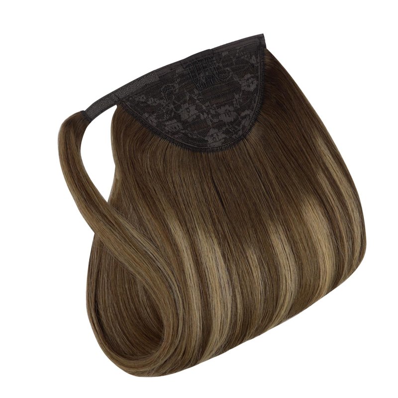 Full Shine Ponytail Hair Extensions 12Inch Balayage Ombre Brown Fading Caramel Brown One Piece Clip In Ponytail Extension Human Hair Wrap Around Pony Tails Hair Extensions 70G