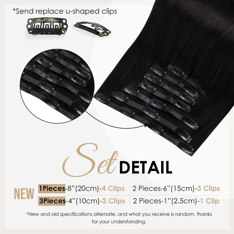 - 【Full Shine Seamless Clip Ins Specification】Full shine invisible human hair clip in extensions 12inch-80g,14-22inch 120g with clips, they are all 8pcs,If you have thick hair, we recommend 1-2 packs to add weight, 2-3 packs to add length. If you have thin hair, we recommend 1-2 packs to add length, 2-3 packs to add weight.