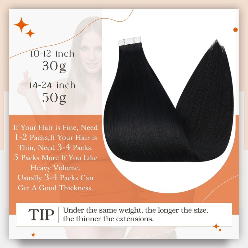 - 3.Each package of adhesive tape hair extensions contains 20 pieces, weighing 50g. We recommend using 3-4 packets of tape in hair extensions for a full head, which is 150 to 200 grams of hair.