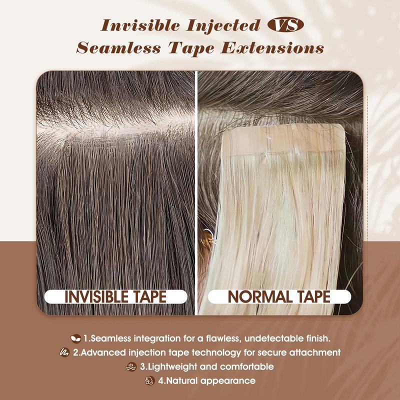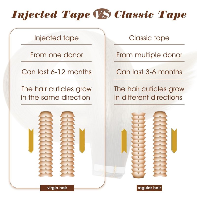 - [Virgin Injection Tape in Hair]Injection Virgin Tape Hair Uses Directly Cut Virgin Ponytail,Unique Cuticle Alignment Technology,Ensuring Each Strand Has A Natural Texture And Shine.This Human Hair Maintains A Long Lifespan,dyeing Via Plant Extract,No Damage To The Hair. It Easy To Install And Remove With Minimal Effort.