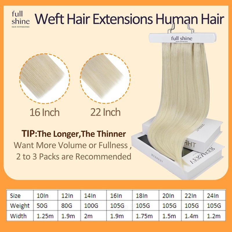 - 【Weft Hair Extensions Human Hair Specification & Recommended Usage】10":50g, 12":80g, 14":100g, 16"-24":105g. Full Shine human hair weft can meet your needs of different wearing position. You can cut any width you want without falling off the edge hair. 1 pack for natural volume, 2-3 packs for thick hair or full head. Full Shine sew in hair extensions real human hair can be styled, curled, dyed, etc.