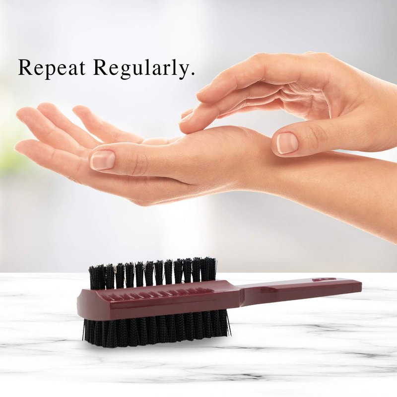 - DOUBLE-SIDED BRUSH: Tufted on both sides of the block, the brush features three rows of short, stiff nylon bristles for scrubbing away stubborn dirt from hands, nails and cuticles, and six rows of long softer nylon bristles for softening elbows and knees.