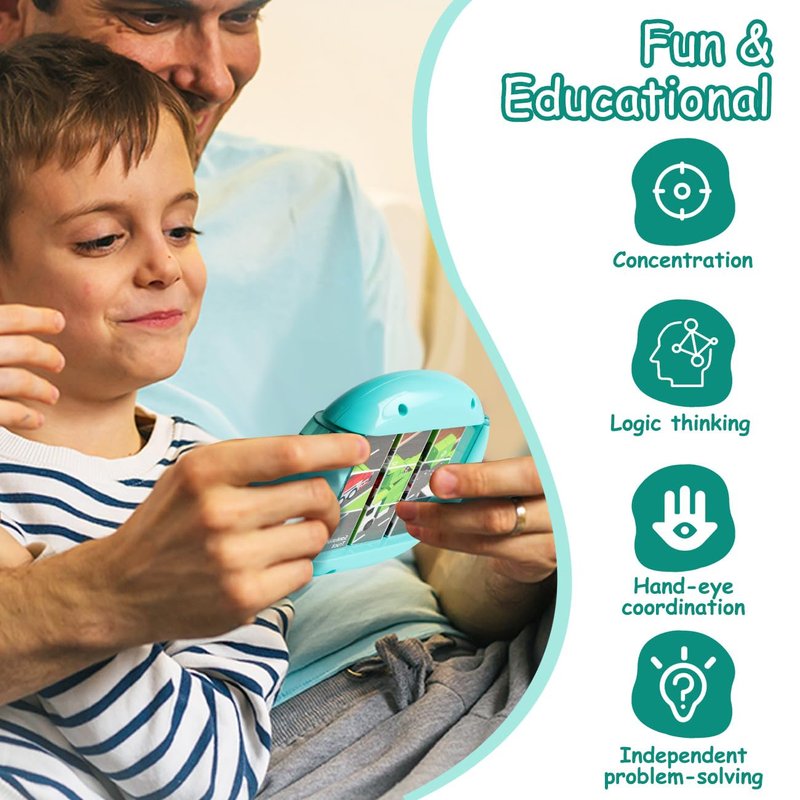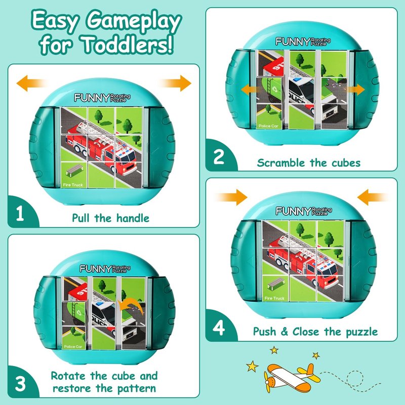 Introducing our Handy Rotating Puzzle: a compact toy perfect for outings! Whether in the car or at a restaurant, this puzzle keeps children quiet and occupied. With its all-in-one design, there's no risk of missing pieces. Designed for preschoolers, our Rotating Puzzle features 4 patterns that can be restored by rotating 9 cubes. It offers just the right level of difficulty for young children. Not only does it provide entertainment, but it also trains finger dexterity, fine motor skills, hand-eye coordination, image cognition, and logical thinking. It promotes patience and concentration too. Safety is our priority. Made of non-toxic and durable materials, this puzzle is built to last. Unlike paper puzzles, it won't easily break or tear. Enjoy a smooth playing experience with no uneven edges. This rotating puzzle makes a fantastic gift for both boys and girls. It's fun, educational, portable, and durable. Children will love playing with it for hours on end. Perfect for birthdays or Christmas!