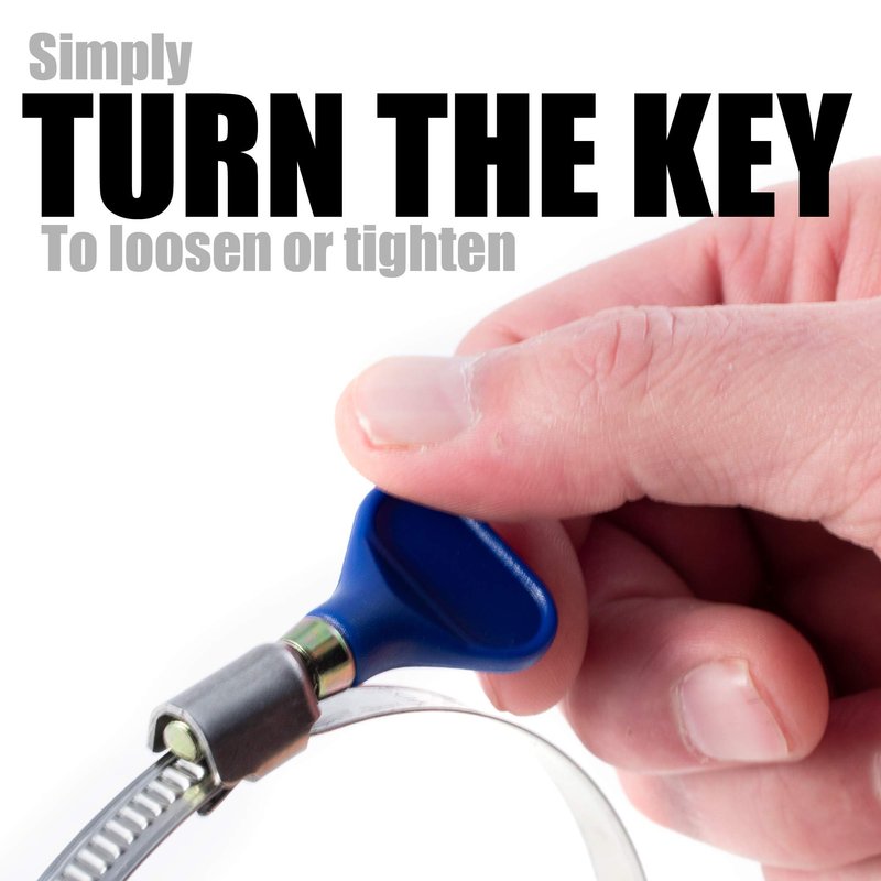 NO MORE TOOLS! – Set your tools aside when installing your ductwork or hose with these handy, easy to tighten hose/duct clamps. Place the clamp where its needed then simply turn the key to loosen or tighten them. LARGE EASY TO TURN KEY - The easy to turn and easy to see blue key is made from a strong and durable polymer. The key is designed to make the securing and un-securing of hose much easier on the knuckles. No more knuckle busting flat head screw drivers or tiny socket wrenches. Simply to turn the key clockwise to tighten, counter clockwise to loosen.