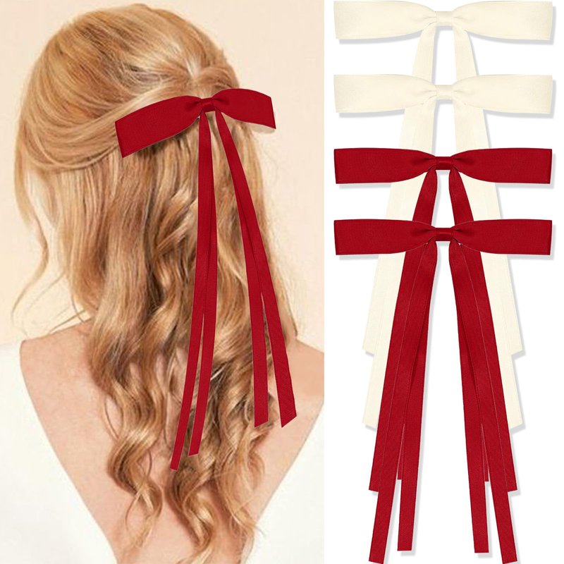 FULZTEY 4 Pack Bow Hair Clips for Women Red Beige Bow Hair Barrettes Silky Bowknot Hair Ribbon Long Tail Fashion Coquette Bows Clips Hair Accessories for Girls