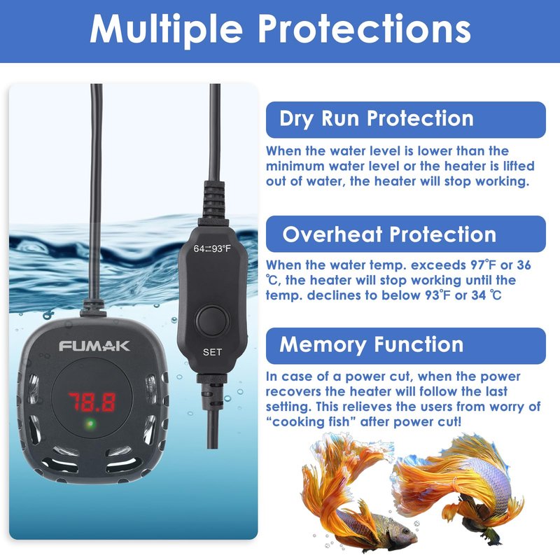 - DRY RUN / OVERHEATING PROTECTION - We've got your fish's well-being in mind. This fish tank heater includes multiple safety measures. It automatically shuts off if the water level drops below the minimum or if the water temperature exceeds 97F, ensuring your fish won't get cooked, especially during power outages.