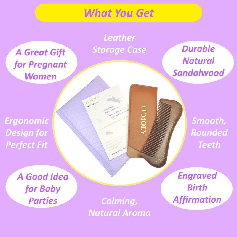 FUMOLY Birthing Comb For Labor Pain - the Durable Natural Golden Sandalwood Wooden Comb ! Designed with the expecting mom in mind, this ergonomic comb is a must-have essential for labor and delivery. Crafted from premium golden sandalwood, this comb not only provides natural pain relief but also adds a touch of elegance to your birthing experience. The comb's wave design perfectly fits your palm, allowing for effortless grip and control during labor. Its unique engravings, featuring cute birth motifs, make it an exquisite souvenir gift to commemorate this special journey. To ensure its longevity, the comb comes with a leather storage case, keeping it safe and protected. Whether you choose a home birth or a hospital delivery, this labor comb is a game-changer. It is highly recommended by doulas and is included in the list of essential supplies for labor and delivery. The natural properties of the wooden comb help alleviate labor pain, providing comfort and relief when you need it the most. Don't let labor pain overshadow the joy of bringing new life into the world. Embrace the natural approach with our Natural Sandalwood Wooden Comb - the perfect companion for your labor and delivery journey. Get yours today and experience the difference!
