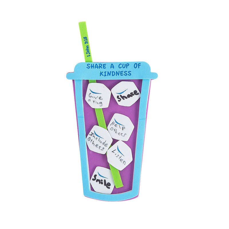 - Three cheers for kindness! With this craft kit, students can create a self-adhesive foam “cup of kindness.” On each ice cube within the cup, you and your students can write down all the ways one can spread compassion. Once completed, display these cups on classroom walls to inspire random acts of kindness all year long! Includes self-adhesive foam pieces. 3 1/2" x 5 1/2" Makes 12.