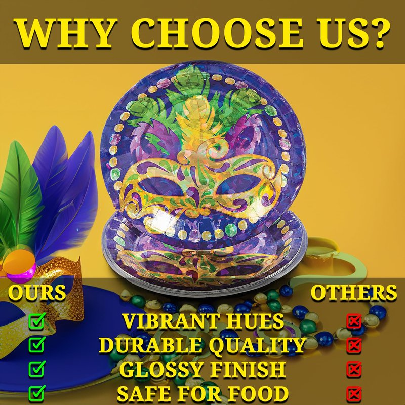 - THEMED CELEBRATION READY: Add vibrancy to your event! These plates are perfect for themed gatherings such as Mardi Gras party offering a festive touch