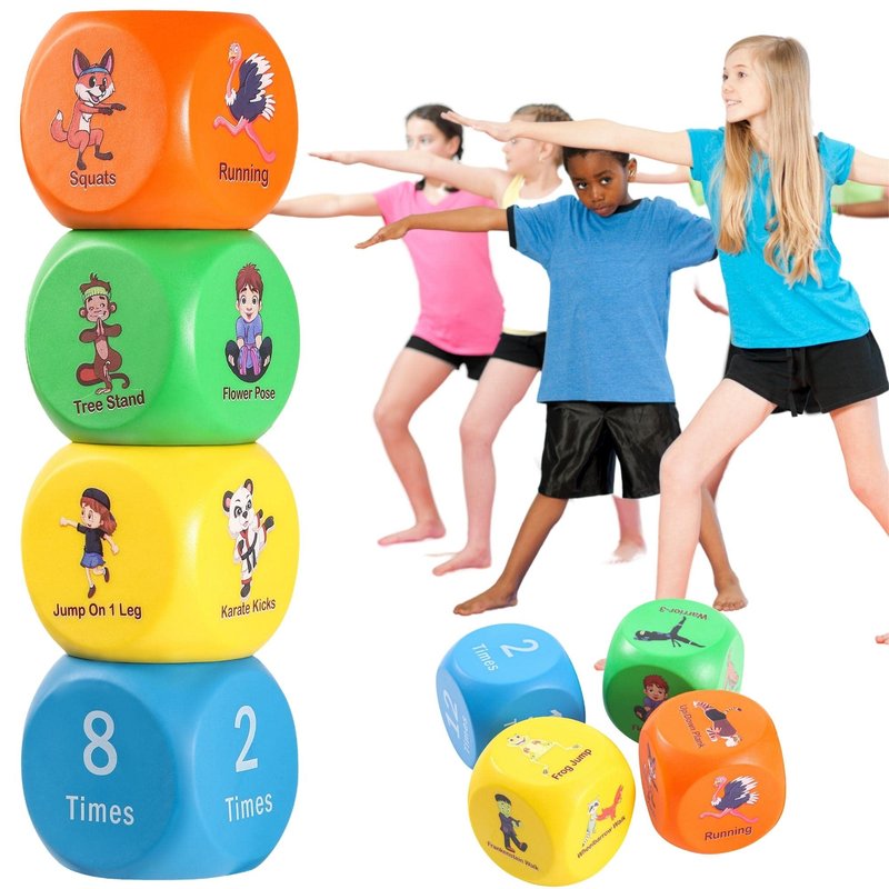 - BIG BENEFITS: In this set you will get 3 action dice and 1 number times dice plus an instruction guide to each action. Encourage kids to exercise whilst having fun, great for home and schools as a teaching aid. Make your next PE lesson much more memorable for the kids using these foam fitness dices. The active benefits of using these dice and playing regularly includes the development of fine and gross motor skills, improved coordination, flexibility, strength and fitness.