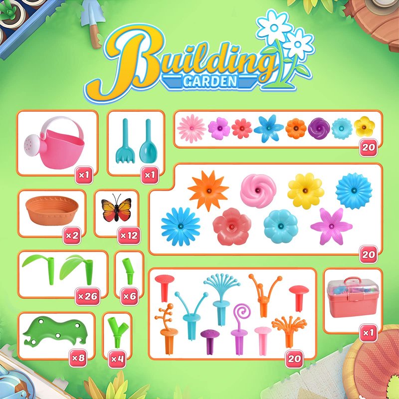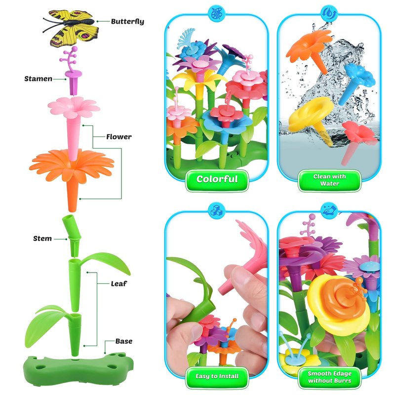 - Flower Building Toys Set for Girls: 148 pcs garden toy set, including flowers, stamens, stems, leaves, butterflies, bases, various tools and a storage box. Crafted from non-toxic, child-friendly, high-quality materials that meet U.S. toy safety standards, each piece has smooth edges ensuring child safety.