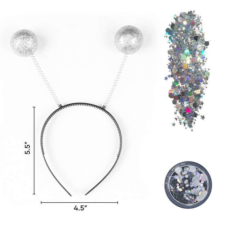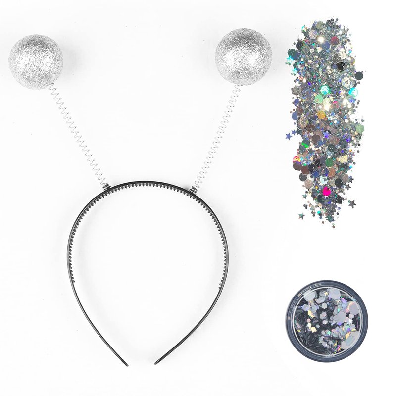- INTERGALACTIC ALIEN HEADBANDS: Elevate your costume game with our Martian-inspired headwear! Each set includes a mesmerizing silver alien antenna headband and 10g of chunky, silver holographic glitter. Get ready to shine at any space-themed event!