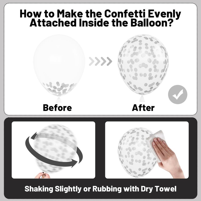 - EASY TO USE - We provide ribbons to assist you in assembling the balloon, along with confetti balloons. Simply inflate the balloons with air or helium, then wipe them with a dry towel or hair to make the confetti stick inside the balloons. However, when filled with helium, since confetti is heavier than helium, it may sink to the bottom of the balloons. To prevent this, you can spray some water inside the balloons before inflating them.