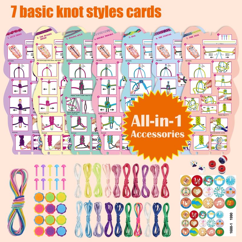 - DIY Jewelry Making Kits for Girls 8-12: Everything your child needs is included: 7 basic knot styles, 20 colorful strings, 12 elastic bands, and 5 big beads. Create beautiful, eye-catching bracelets with unique buttons. Plus, 15 different fashion-designed stickers to make each day new and different.