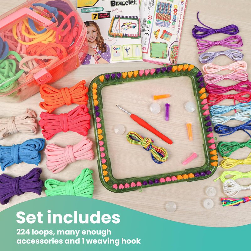 - 224 Craft Loops: With 28 loops in 8 bright colors. 15 elastics, and 15 colorful strings for making friendship bracelets. You'll have enough for a variety of DIY projects - potholders, headbands, coin purses, and handbags by sewing edges