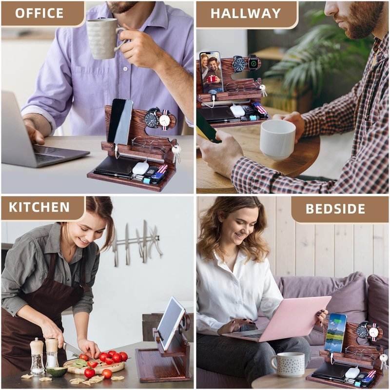 - Elegant Design: This phone docking station for men it's a great phone and watch stand tool for people who often lose their things. Our wooden organized stand features a dual design, ideal for organizing like coins, rings, keys, and more