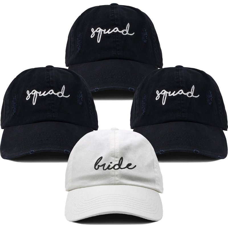 - WHEN TO WEAR: Celebrate your bachelorette in style in these gorgeous sun hats. The “just married” hat will look adorable on your honeymoon while the “bride” & “squad” bundles will be the perfect accessory for your bridal shower or bach party. Your bridesmaids will absolutely love these bridal baseball hats! Makes a great gift for the bride on her wedding day or even for the mother of the bride or groom.