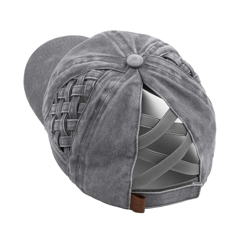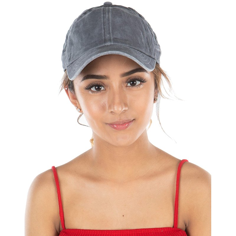 - GREAT LOOK: Distressed, washed hat give off a vintage look. Back of hat has criss-cross elastic bands for ponytail hole that make the hat look great with or without a ponytail. 3 different ponytail holes for the option of a low ponytail/messy bun, middle ponytail/messy bun, or high ponytail/messy bun. With plenty of versatility, this hat design is unique and stylish
