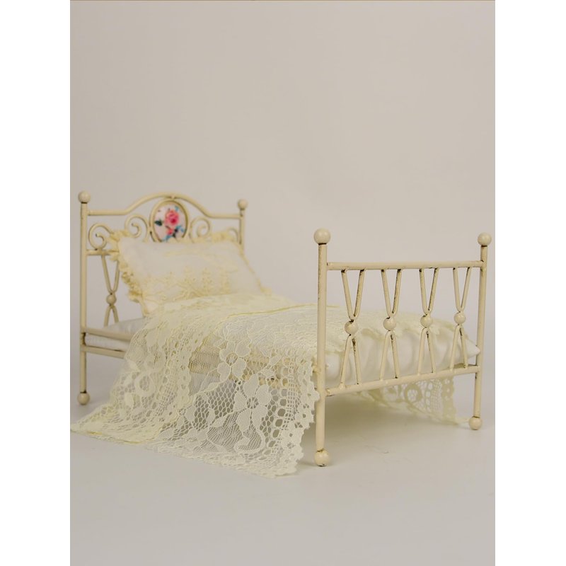 Funky Mini House 1:12 Scale Miniature Beige Iron Bed with Lace Bedding, Handmade Vintage Dollhouse Furniture BJD Ob11 Accessories