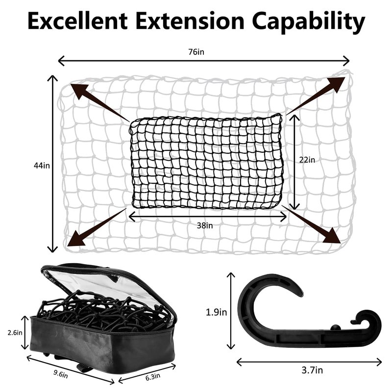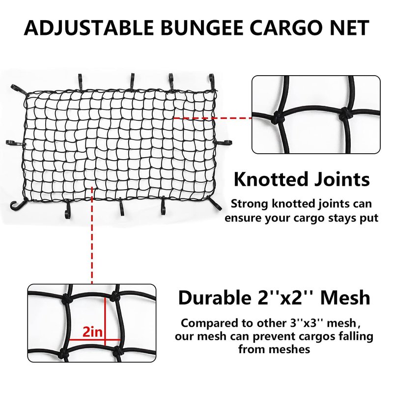 - HEAVY DUTY BUNGEE CARGO NET: 22"x 38" stretch cargo net could stretched to 44"x 76" (☀Theoretical Length), which designed with 3/16'' extra thick elastic webbing and 2 "x 2" tight mesh squares to provide superior strength and all-round protection when stretched over larger cargo items, and the squares with knots will also enhance strength and integrity to prevent small items from falling out, (please buy according to the unstretched size!)