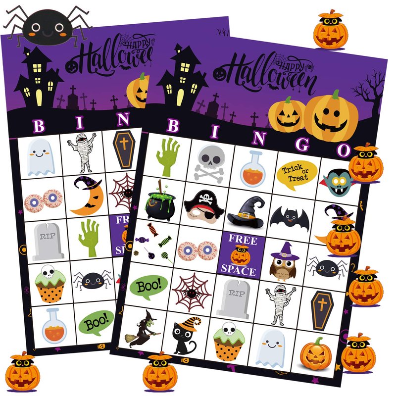 - Halloween Bingo Card Party Game Set: Package Includes 24 unique kids bingo player cards, 385 marking chips, and 2 caller chips.Support members to playing ,great family and even mommy time game with your kiddo