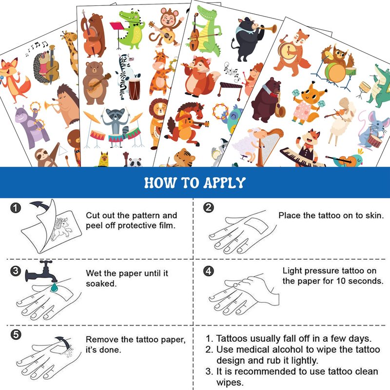 - PACKAGE INCLUDES: You will get 55PCS funny animal with music waterproof temporary tattoos in 4 sheets, each sheet size 11.43*15.7 cm ( 4.5 * 6.2 inches), enough to use and share with friends and family.