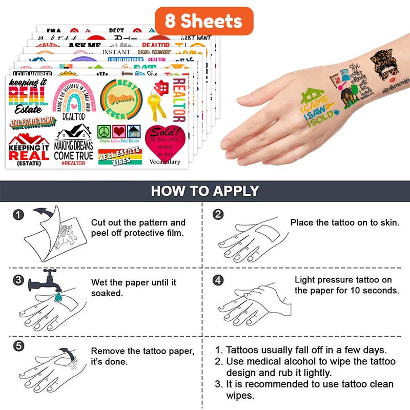 - Cute And Funny Realtor Estate Agent Themed Tattoos: Funny Realtor Estate Agent Temporary tattoos Stickers, features an assortment of themed, colors are bright, and designs are adorable, use them as party favors and you will love. Perfect for themed party, birthday activities, school reward and other party events. They will be your favorite small gifts.